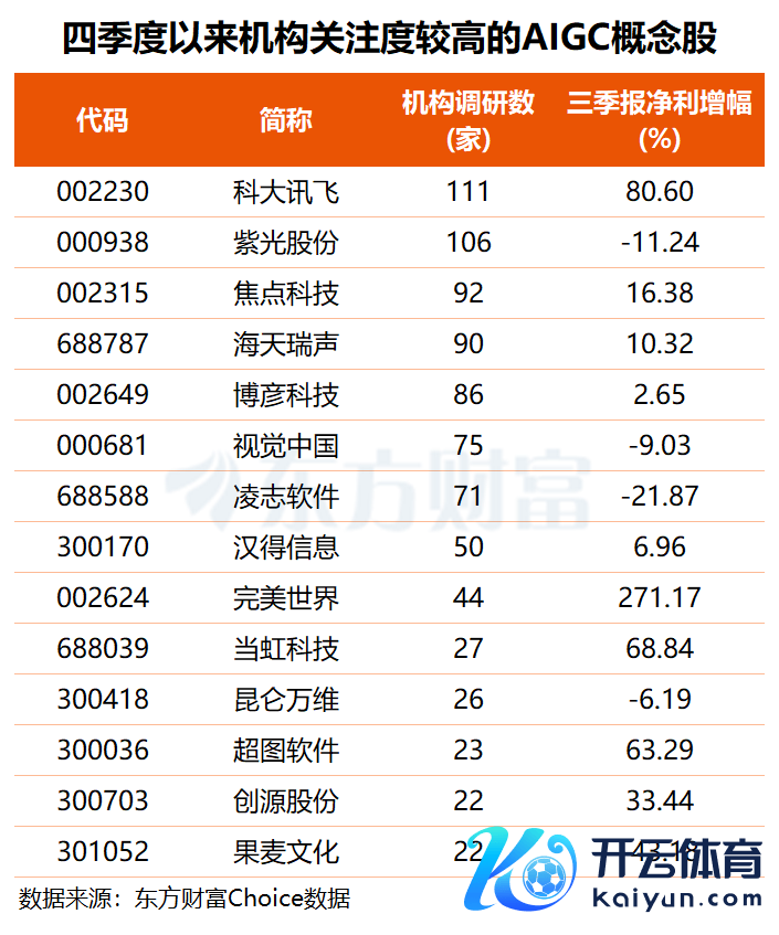 机构调研方面,参加四季度以来,共有23只AIGC见地股取得机构调研,其中科大讯飞、紫光股份的机构眷注度最高,10月以来均获逾百家机构劝诱调研。焦点科技、海天瑞声、博彦科技、视觉中国、凌志软件等个股的机构调研数也齐超50家。