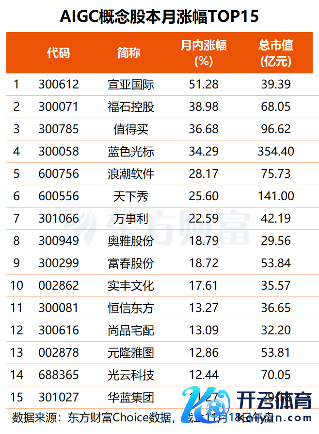 东方钞票Choice数据流露,A股商场122只AIGC见地股中,超大约个股年内股价杀青高涨,其中,巨东说念主网罗、开普云等5股股价翻倍,浙文互联、福昕软件、科大国创等20余股区间涨幅超50%。