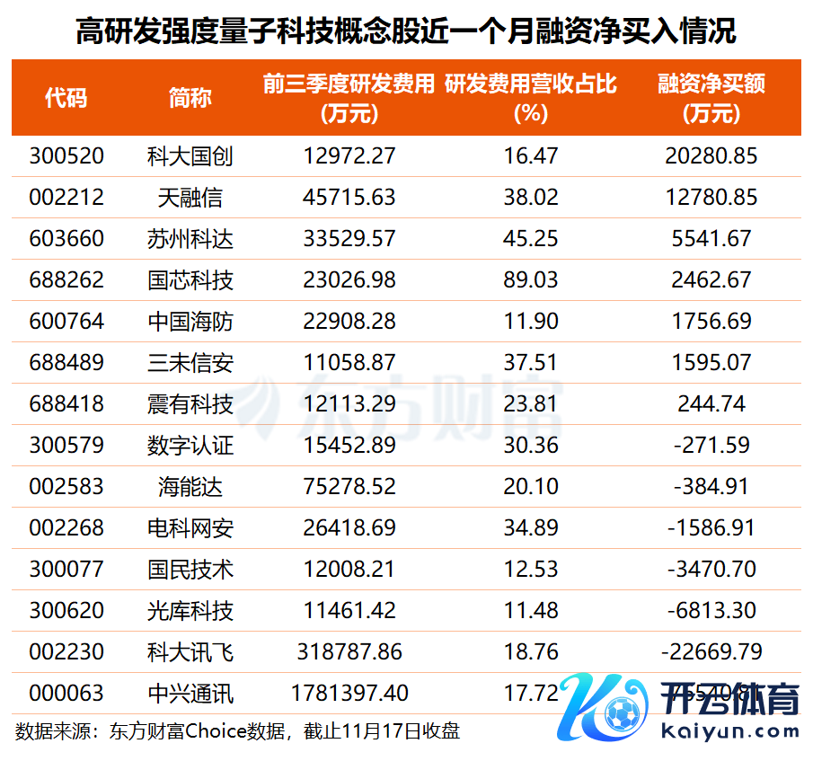值得谨慎的是,上述31股中,研发用度占营收比例超10%的量子科技看法股有14只。近一个月,已有多只高研发强度个股获杠杆资金加仓。其中,科大国创、天融信折柳获融资客抢筹2.03亿和1.28亿元。