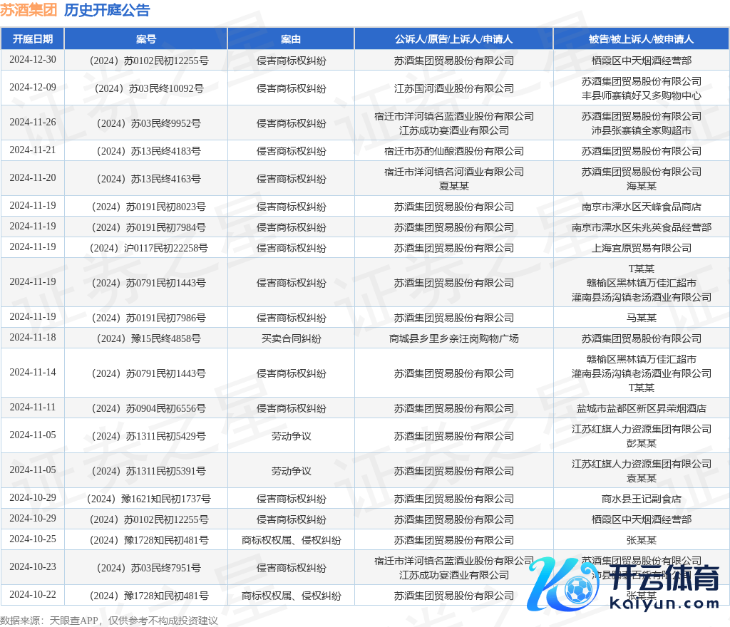 本站音讯,笔据天眼查APP暴露,近日公布了一则苏酒集团营业股份有限公司看成被告/被上诉东谈主的开庭公告,注释实践如下: