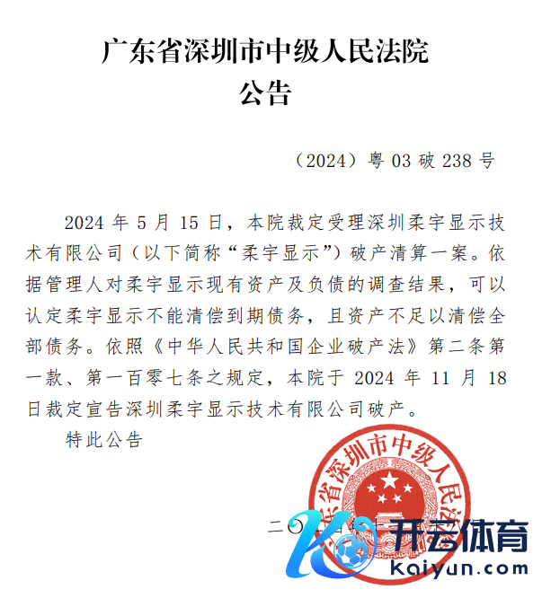 该裁定泄露,依据惩处东谈主对柔宇泄露现存金钱及欠债的窥察成果,不错认定柔宇泄露不行璧还到期债务,且金钱不及以璧还扫数债务。依照《中华东谈主民共和国企业停业法》第二条第一款、第一百零七条之章程,深圳中院于2024年11月18日裁定宣告柔宇泄露停业。