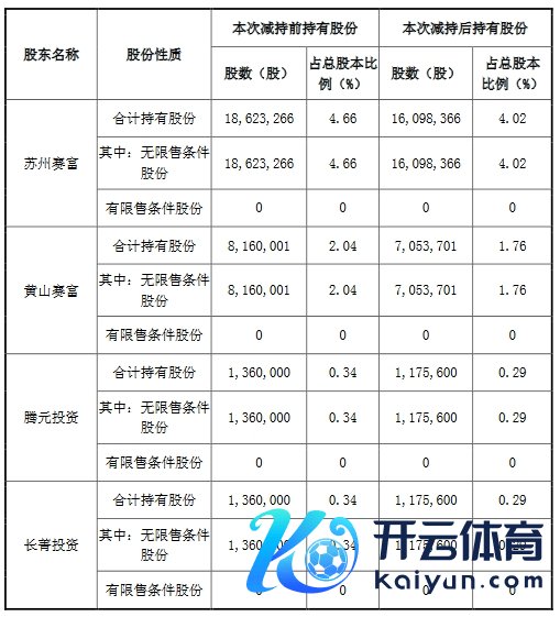 公司于2024年8月30日表现了《对于公司抓股5%以上鼓动减抓股份的预表现公告》(公告编号:2024-052),鼓动苏州赛富璞鑫医疗健康产业投资中心(有限结伴)(以下简称“苏州赛富”)、黄山赛富旅游文化产业发展基金(有限结伴)(以下简称“黄山赛富”)、天津赛富盛元投资处置中心(有限结伴)-嘉兴腾元投资结伴企业(有限结伴)(以下简称“腾元投资”)、北京谈同长菁投资处置中心(有限结伴)(以下简称“长菁投资”),四者系统一扫尾下的企业,为一致步履东谈主,抓有股份合并规划(以下合称“赛富投资”),筹备自该公告表现之日起十五个交过去后的三个月内,以聚拢竞价交往形貌减抓的股份数目不普及4,000,000股(占公司总股本的比例为1%)。