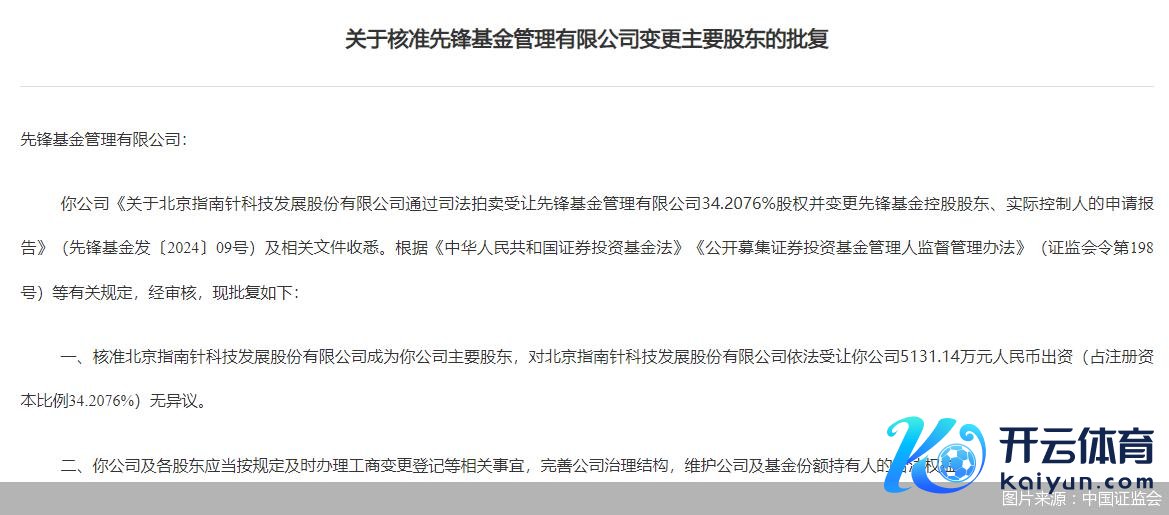 北京商报讯(记者 李海媛)12月6日,中国证监会发布对于核准前卫基金变更主要激动的批复,核准北京指南针(300803)科技发展股份有限公司(以下简称“指南针”)成为前卫基金主要激动开云网页版登录·官方网站入口,对指南针照章受让前卫基金5131.14万元出资(占注册成本比例34.2076%)无异议。