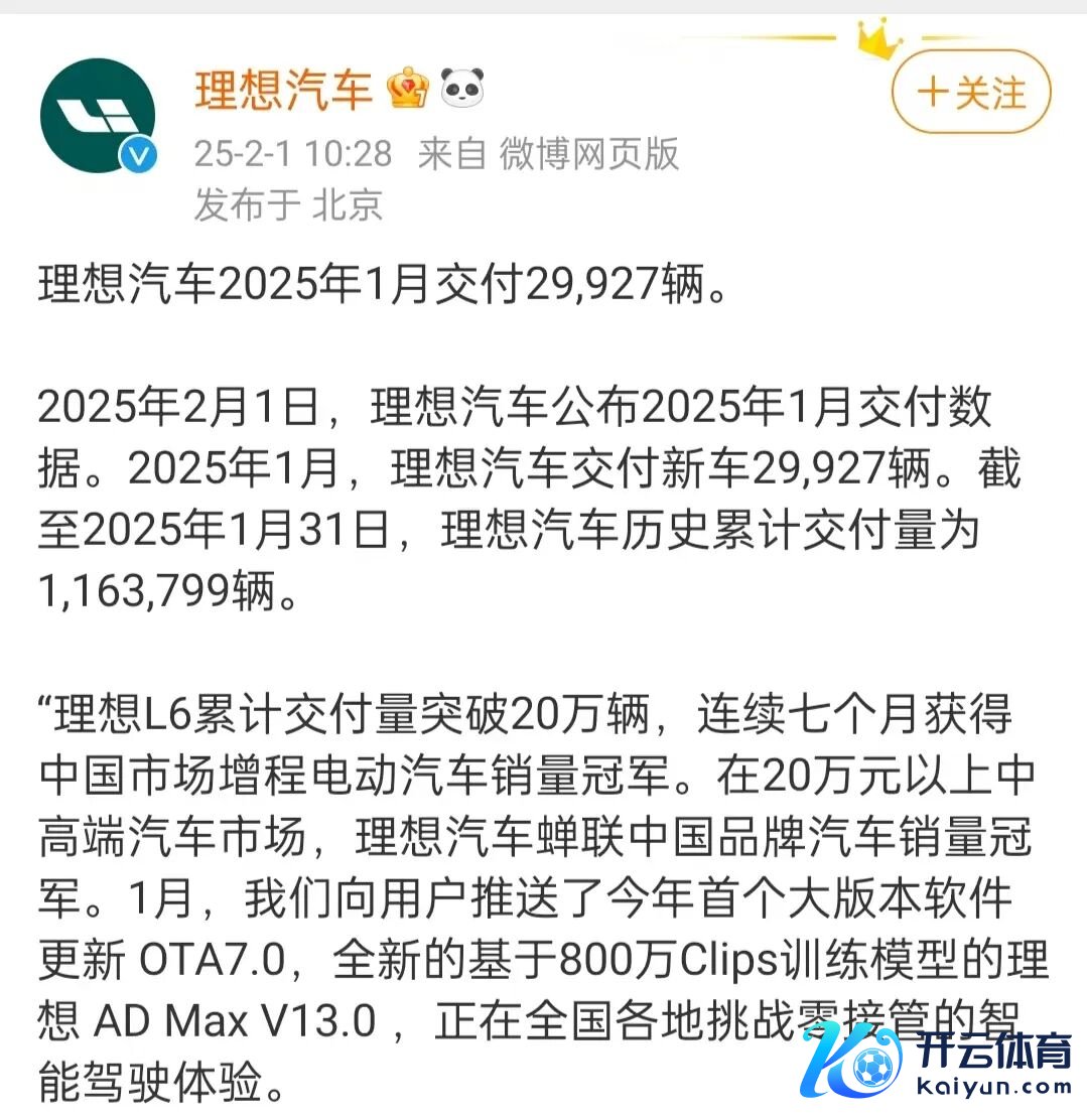 看成2024年新势力“销冠”,理念念汽车在2025年的首月发达也不逊色。1月,理念念汽车托福新车29927辆。箝制2025年1月31日,理念念汽车历史累计托福量为116万辆。