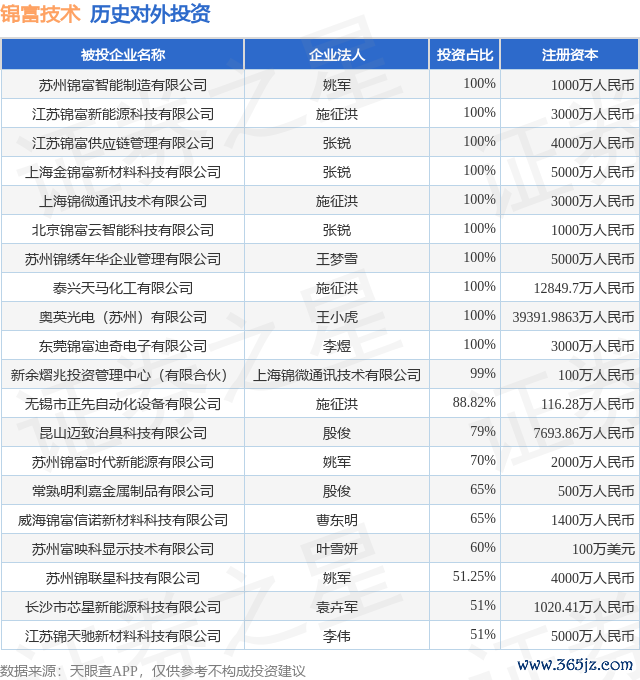 本站音信,阐述天眼查APP显现,锦富工夫(300128.SZ)新增沿途对外投资事件,被投资公司为苏州锦富智能制造有限公司,法定代表东说念主姚军,投资占比为100%。该公司从事计较机、通讯和其他电子开采制造业,注册老本为1000万东说念主民币。现在,锦富工夫共存在对外投资31项,投资占比前20的阵势见下表: