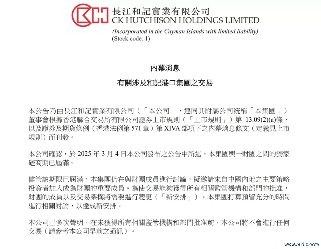 7月28日,长和发布公告暗示,公司证据,于2025年3月4日发布公告中所述,集团与一财团之间的独家商期已届满。尽管该期限已届满,集团仍在与财团成员进行商量,拟邀请来自中国内地之主要政策投资者加入成为财团的垂危成员。为使交游概况取得扫数干系监管机构和部门的批准,财团的成员以及交游架构将需要进行变更(“新安排”)。集团想象预留充分的技巧进行干系商量,以达成新安排。
