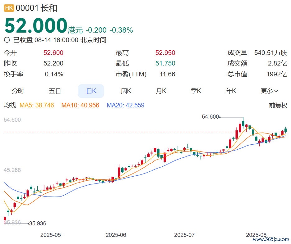 本年以来,长和股价捏续高潮,搁置8月14日收盘报52港元,年内已涨超30%,总市值近1992亿港元。