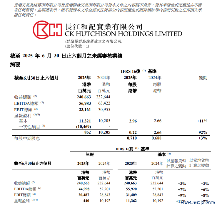 在营运方面,集团于2025年上半年按IFRS 16前基准规划之基本盈利净额按年隆重增长11%至港币113.62亿元。录得增长乃因以申报货币规划之基本EBITDA及EBIT较2024年上半年区别加多7%及9%,主要由于口岸部门增长坚强、零卖部门有所改善、基建部门孝敬上升及CKHutchison Group Telecom(‘CKHGT’)与库务业务均阐述理思,以及集团因出售和黄医药部分非中枢财富所录得之收益。上半年因商品价钱回落及大限制爱护与磨真金不怕火步履裁汰Cenovus Energy孝敬并对增长形成不利影响。